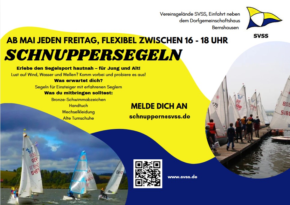 Die Segler-Vereinigung Seeburger See e.V. (SVSS) bietet zur kommenden Segel-Saison ab Mai 2026 jeden Freitag die Gelegenheit zum Schnuppersegeln zwischen 16 und 18 Uhr an. Erfahrene Segler begleiten Einsteiger. Um Anmeldung wird gebeten. Voraussetzung ist das Bronze-Schwimmabzeichen. Mitzubringen sind ein Handtuch, alte Turnschuhe und Kleidung zum Wechseln. Treffpunkt ist das Vereinsgelände des SVSS, Einfahrt rechts […]