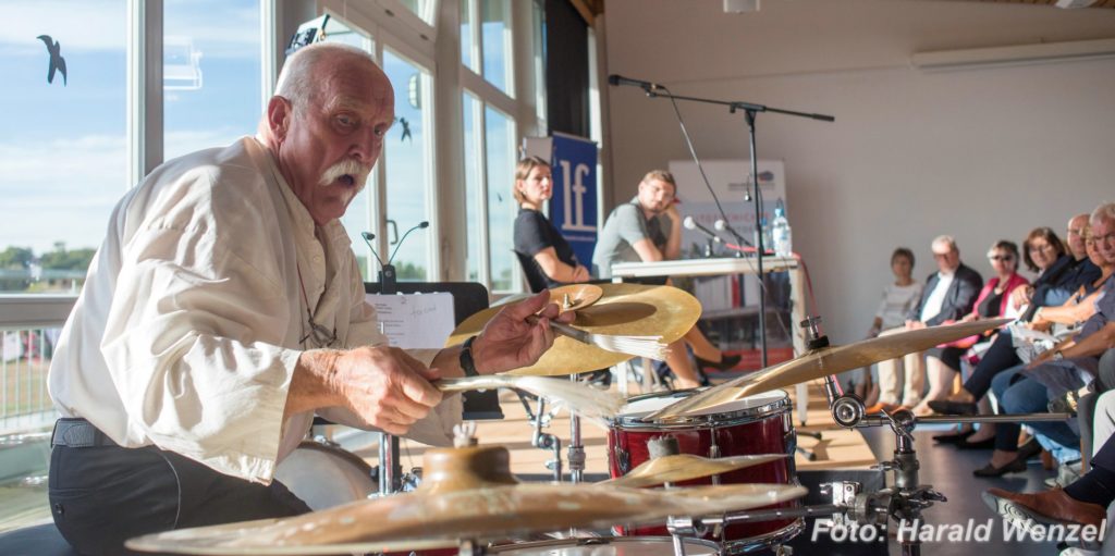 Als drittes Element der Darstellung nahmen Rhythmen, Töne, Klänge und Stimme des Perkussionisten Günter Baby Sommer den Raum ein, mal luftig flüsternd, kaum noch hörbar, dann wieder klagend, reißend, fordernd, aufrüttelnd, schneidend und treibend.