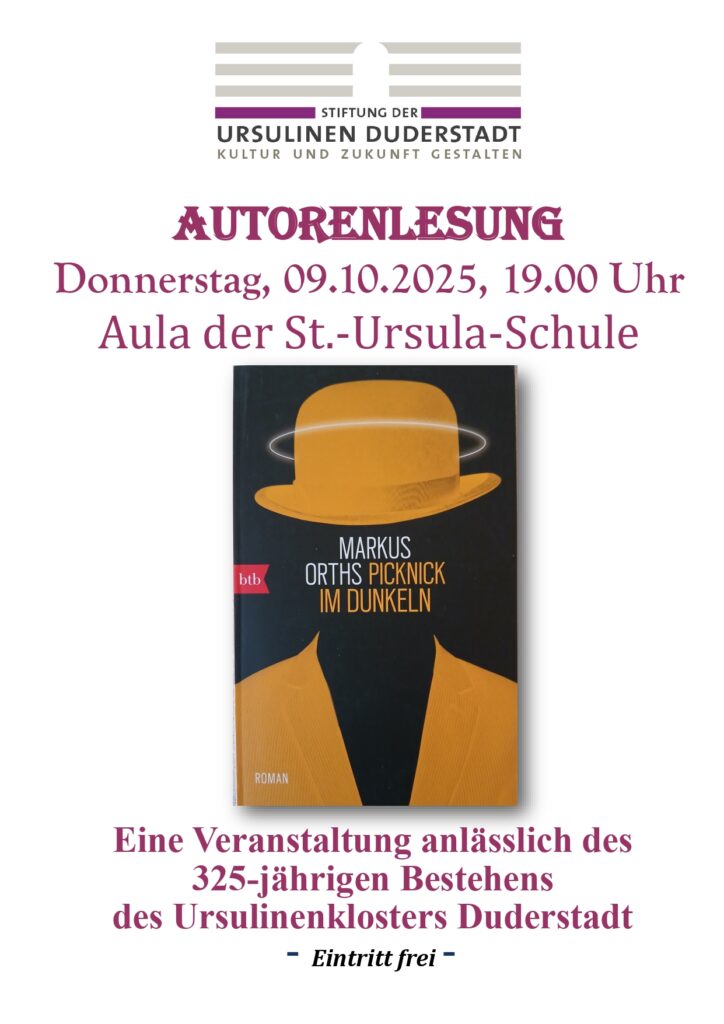Mit einer Autorenlesung am Donnerstag, 9. Oktober 2025, werden die Veranstaltungen zum 325-jährigen Jubiläum der Ursulinen in Duderstadt fortgeführt. Markus Orths stellt seinen Roman „Picknick im Dunkeln“ in der Aula der St.-Ursula-Schule vor. Beginn ist um 19 Uhr.