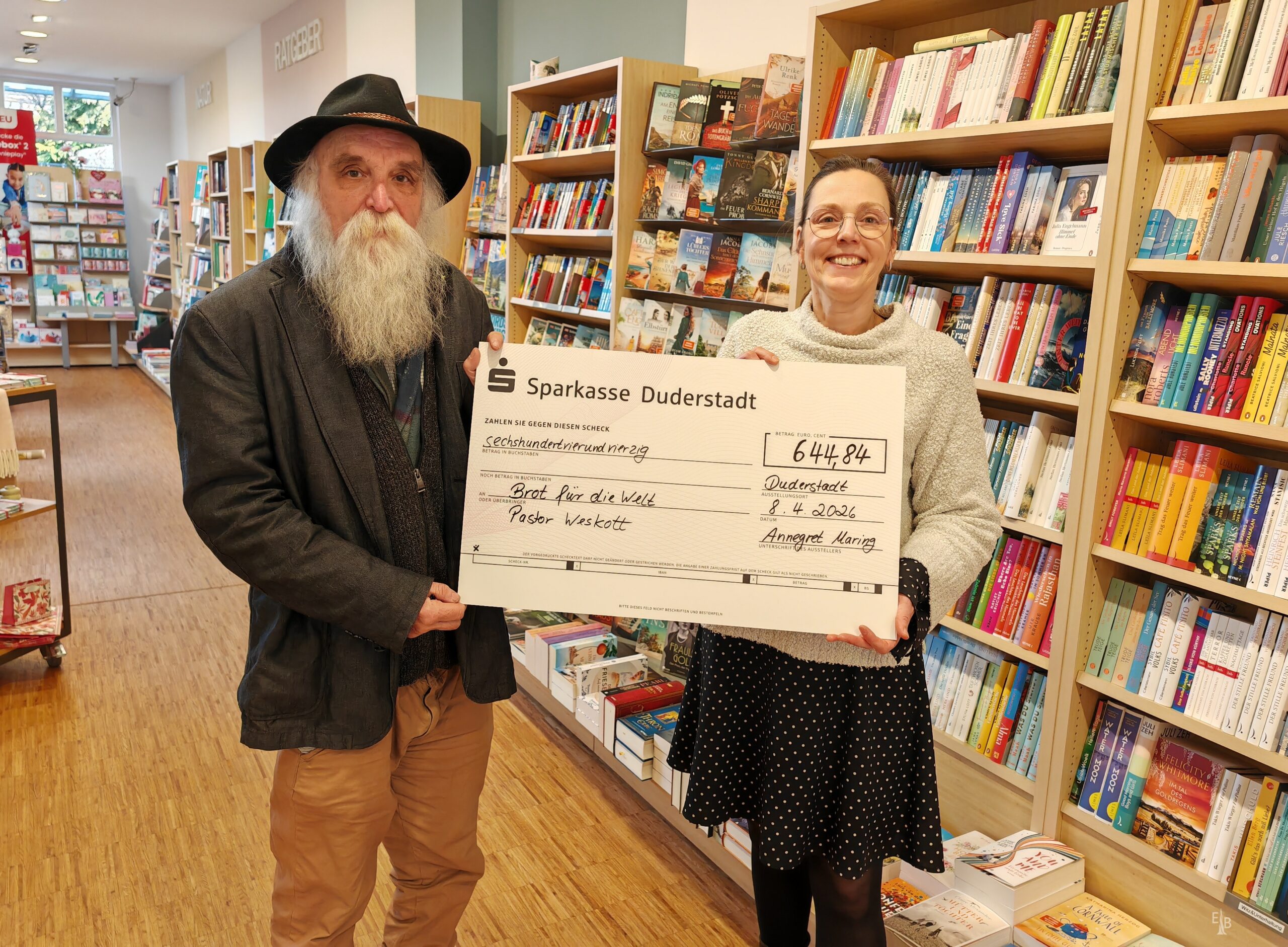 Bis Februar 2026 wurden in der Duderstädter Kulturstube Bücher ausgestellt. Das Besondere: All diese Werke stammten aus der DDR und wurden von Pastor Martin Weskott nach der Grenzöffnung vor der Vernichtung gerettet. Im Rahmen der Ausstellung wurden auch Kinderbücher aus der DDR verkauft, und die Erlöse, nämlich 644 Euro, wurden nun für „Brot für die Welt“ gespendet.