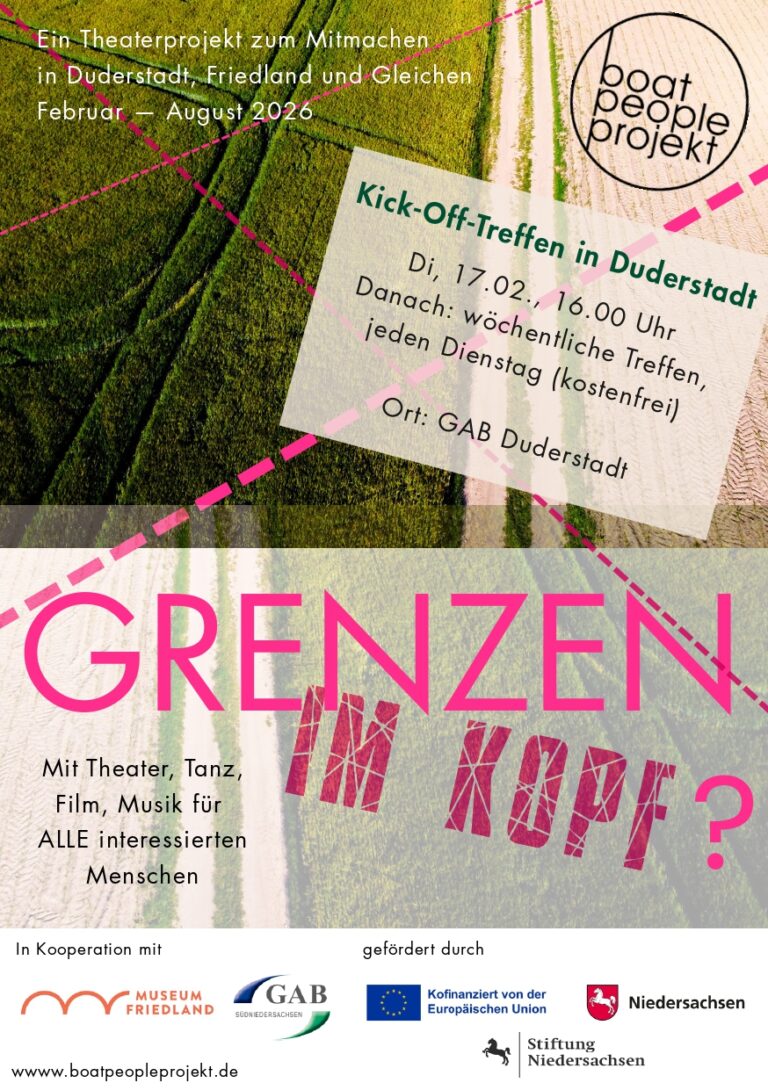 Unter dem Titel „Grenzen – im Kopf?“ startet am Dienstag, 17. Februar 2026, von 16 – 18 Uhr ein Theaterprojekt zum Mitmachen in den Räumen der GAB in Duderstadt, Charlottenburger
