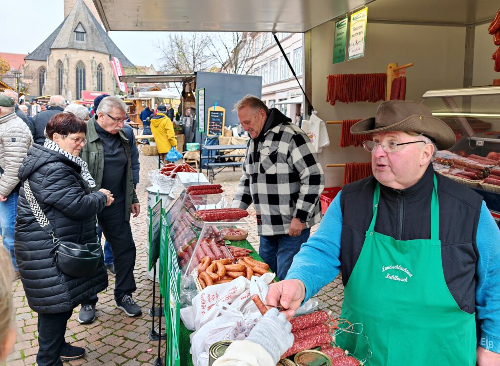 Der Eichsfelder Wurstmarkt lädt ein zum Schlemmen am Wochenende 08. / 09. November 2025 in der Duderstädter Altstadt. Mit rund 60 Verkaufsständen stehen herzhafte Eichsfelder Spezialitäten und regionale Direktvermarktung im Vordergrund. Veranstalter ist der Treffpunkt Stadtmarketing Duderstadt.