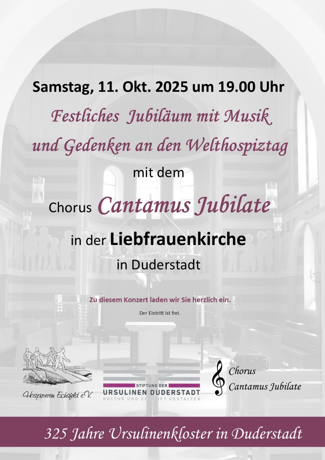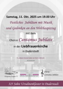 Zum 325-jährigen Jubiläum der Ursulinen in Duderstadt und zum Gedenken an den Welthospiztag wird ein Chorkonzert des Chorus Cantate Jubilate in der Liebfrauenkirche präsentiert. Der Eintritt ist frei, um Spenden wird gebeten.