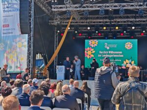Bürgermeister Christian Zwingmann begrüßte die zahlreichen Gäste aus Politik und Wirtschaft, darunter Thüringens Ministerpräsident Mario Voigt, Sponsoren, Unterstützer, Anwohner und natürlich die Mitglieder des LGS-Teams und alle ehrenamtlichen Helferinnen und Helfer, ohne deren großen Einsatz es die Landesgartenschau in Leinefelde nicht gäbe. Zehn Jahre Vorbereitung habe es gebraucht, Höhen und Tiefen seien durchschritten worden wie der Stillstand während der Corona-Pandemie und Verzögerungen durch archäologische Funde. Doch der Tag der offiziellen Eröffnung sei nun „Erleichterung pur“, freute sich Christian Zwingmann.