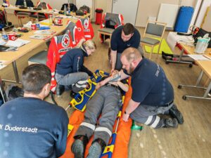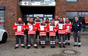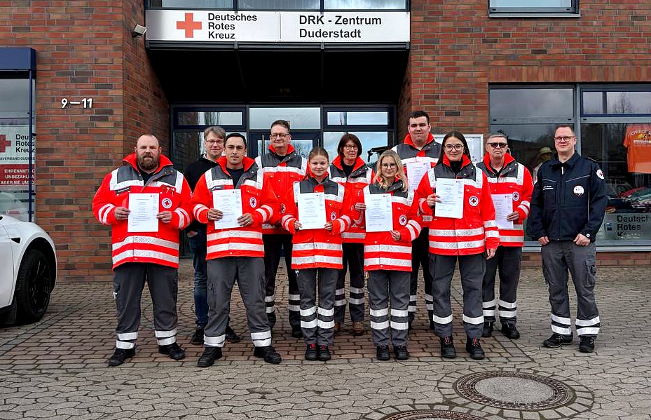 Acht Tage lang wurden im DRK-Zentrum Duderstadt Notfallsituationen geübt und Theorie gepaukt. Neun DRK-Mitglieder, die bereits fundierte Kenntnisse in der Ersten Hilfe nachweisen konnten, haben an der Sanitätsausbildung mit abschließender Prüfung teilgenommen – und bestanden. Damit sind sie befugt, als Sanitätsfachdienst auch im Katastrophenfall die notfallmedizinische Versorgung von Verletzten und Verwundeten zu gewährleisten.