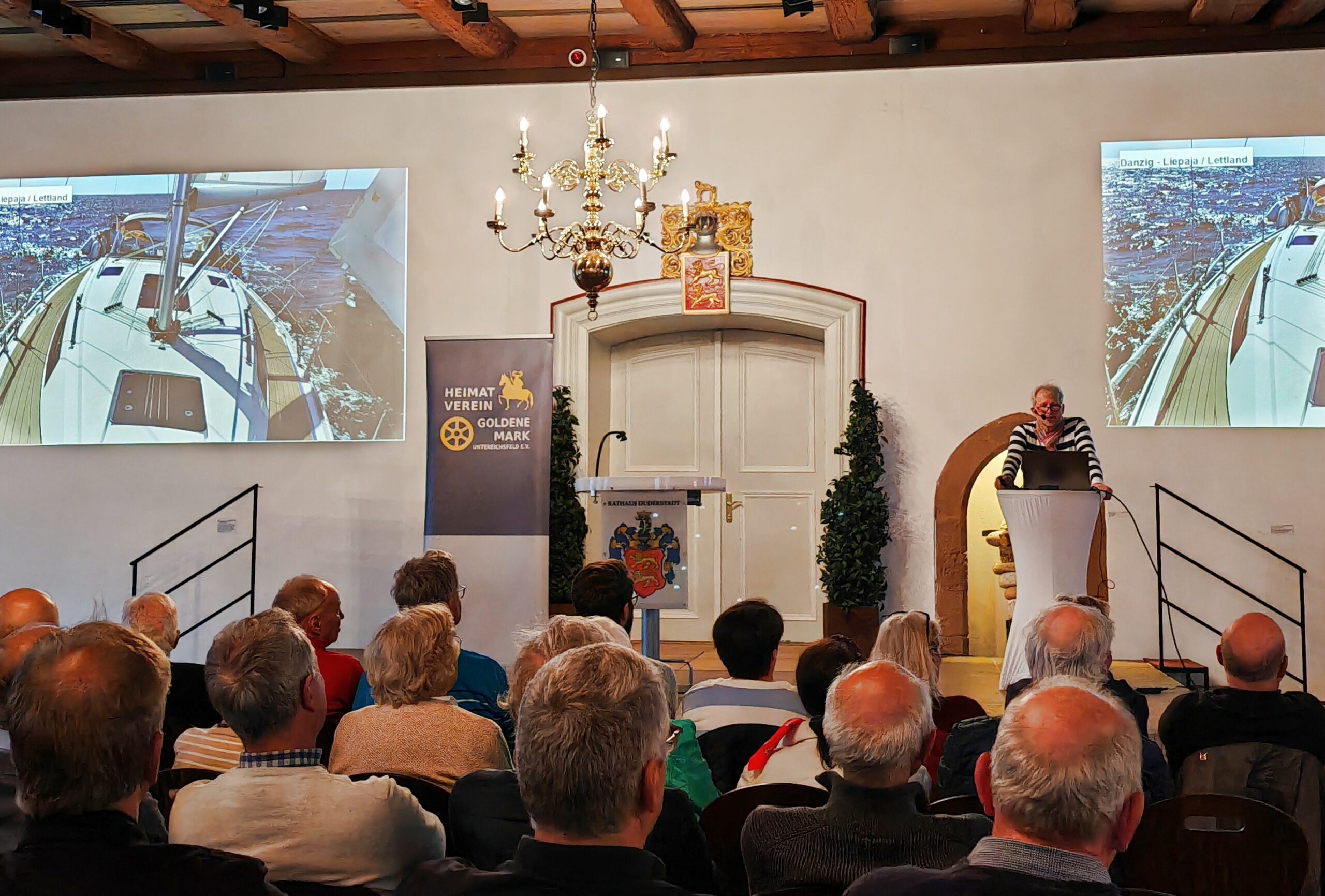Den Auftakt machte gleich nach der Versammlung der Kassenwart Lothar Klingebiel, der in seinem Vortrag „Ostseereise unter Segeln“ im Duderstädter Rathaussaal auch mal weit über die Grenzen des Eichsfelds hinausblicken ließ. Mit seinem Segelboot, einer Bavaria 37, steuerte er die Häfen der Ostsee an, von Kühlungsborn nach Polen, Lettland, Estland, Schweden, Dänemark und wieder Kühlungsborn. In sieben Wochen erlebte er mit wechselnder Crew – Familienmitglieder und befreundete erfahrene Segler – auf 1.358 Seemeilen (2.515 km) hohe Wellen, idyllische Sonnenuntergänge, Anspannung in der Nähe der russischen Küste und beeindruckende historische Orte in den 31 angelaufenen Ostseehäfen.