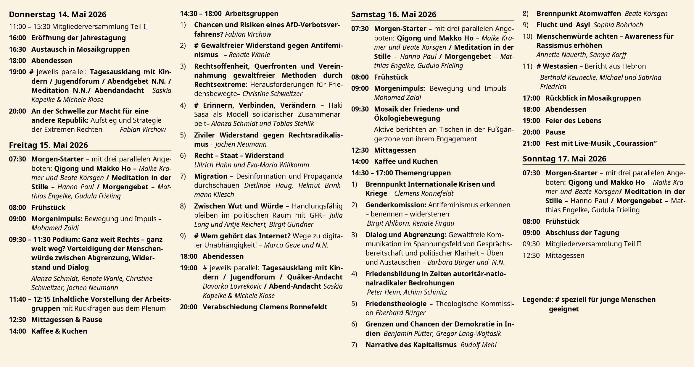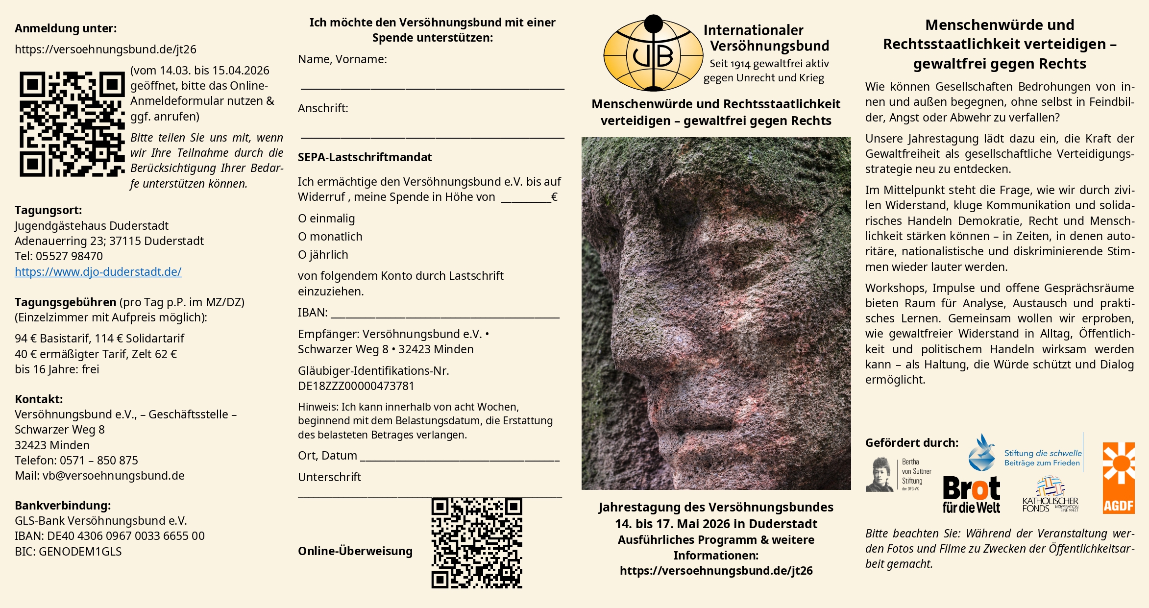 Die Jahrestagung des Internationalen Versöhnungsbundes findet vom 14. bis 17. Mai 2026 in Duderstadt im Jugendgästehaus statt. Unter dem Titel „Menschenwürde und Rechtsstaatlichkeit verteidigen – gewaltfrei gegen Rechts“ diskutieren Teilnehmende aus Friedensarbeit, Zivilgesellschaft und Wissenschaft über Strategien gegen rechtsextreme und autoritäre Entwicklungen.