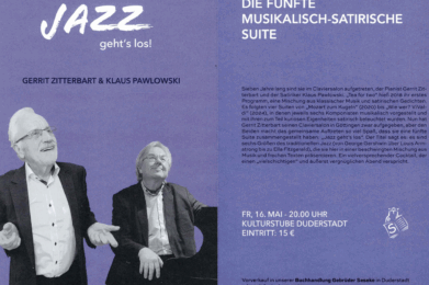 Als „Die fünfte musikalisch-satirische Suite“ präsentieren der Pianist Gerrit Zitterbart und der Satiriker Klaus Pawlowski ihr aktuelles Programm „Jazz geht’s los!“ am Freitag, 16. Mai 2025, in der Duderstädter Kulturstube, Marktstraße 26. Beginn ist um 20 Uhr. Tickets (15 Euro) gibt es im Vorverkauf in der Buchhandlung Gebrüder Seseke (Telefon 05527 2528). Bekannt aus dem … „Jazz geht’s los!“ in der Duderstädter Kulturstube mit Gerrit Zitterbart und Klaus Pawlowski weiterlesen