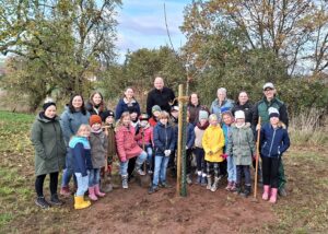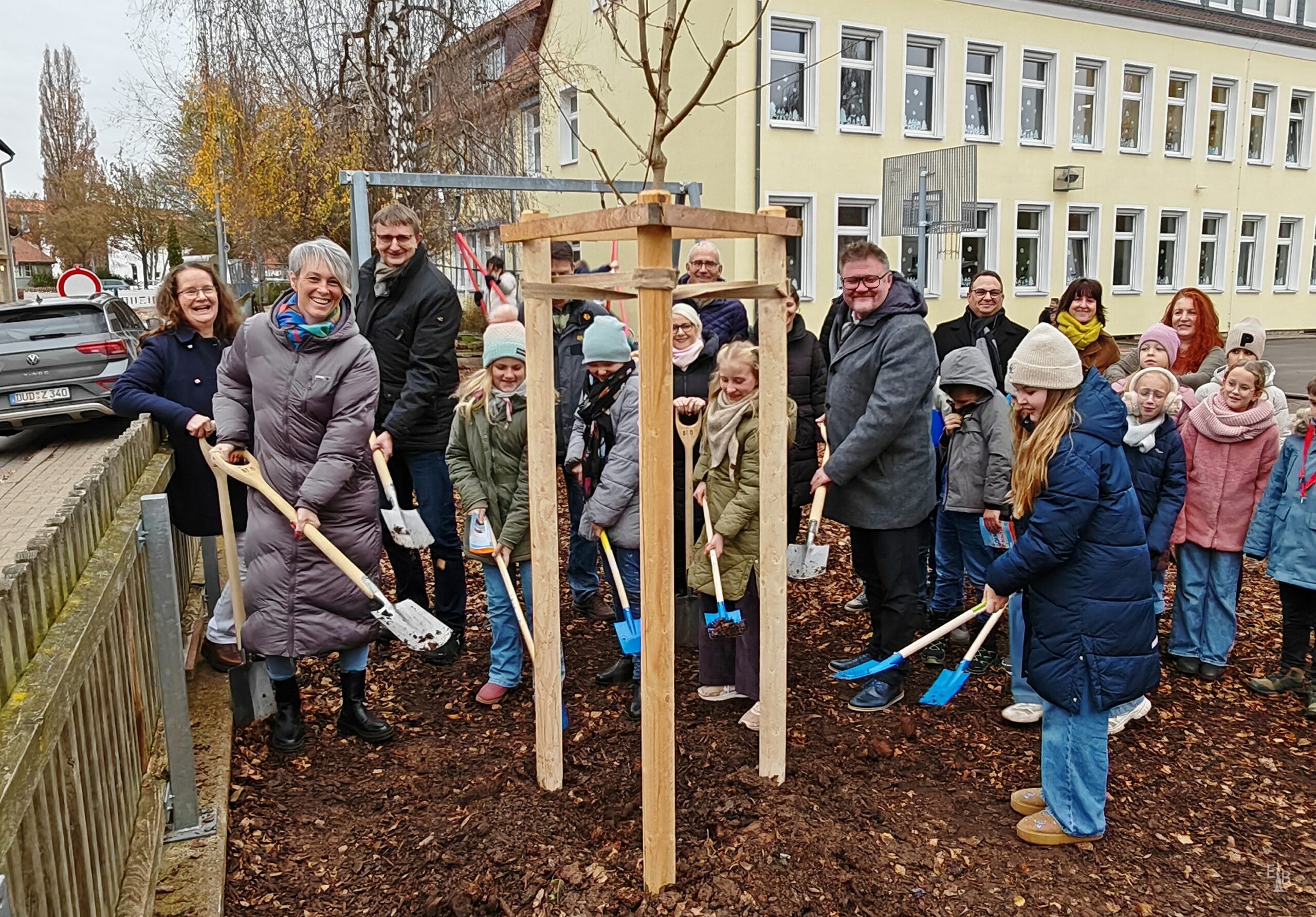 Nach der Abschlussveranstaltung „Klima macht Schule“ trafen sich alle Beteiligten auf dem Schulhof, wo ein junger Baum gepflanzt wurde. Der dient zukünftig nicht nur dem Klima und als Schattenspender im Sommer, sondern auch als Symbol für Wachstum und Nachhaltigkeit. Alle Grundschulen wollen sich weiterhin mit den Kindern für Klimaschutz einsetzen.