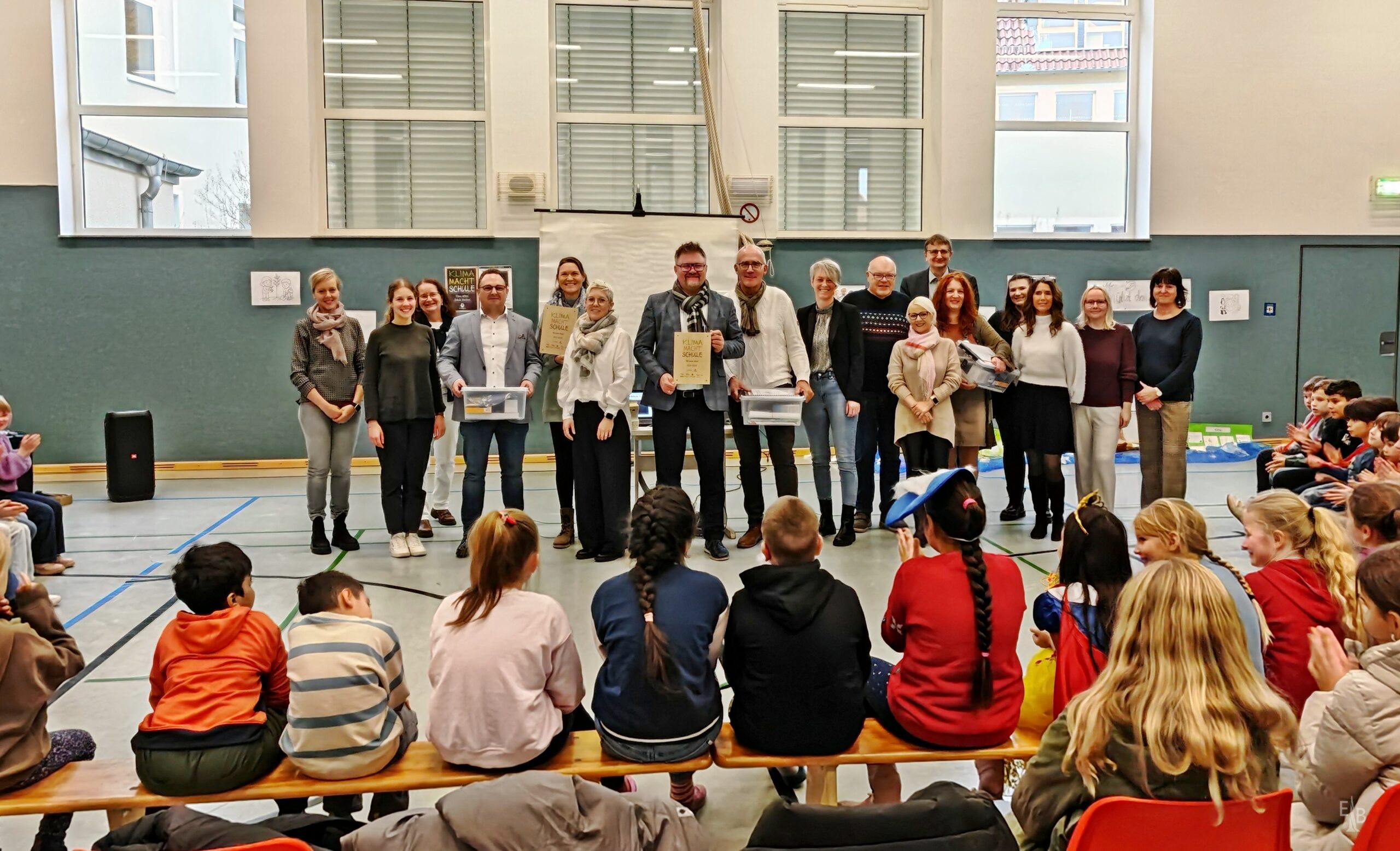 Schulleiter Manfred Görth begrüßte zur Abschlussveranstaltung des Projektes die zahlreichen Gäste, darunter auch die Schülerinnen und Schüler der beiden anderen teilnehmenden Schulen, der Maximilian-Kolbe-Grundschule Gerblingerode und der St.-Nikolaus-Grundschule Tiftlingerode, Bürgermeister Thorsten Feike, die Duderstädter Klimaschutzmanagerin Anna-Lena Nordmann, die beiden Ortsbürgermeister Christian Wüstefeld (Gerblingerode) und Klaus Deppener (Tiftlingerode) und die VertreterInnen der Sponsoren EAM, EEW, Harz Energie, Sparkasse Duderstadt und Firma Daume.