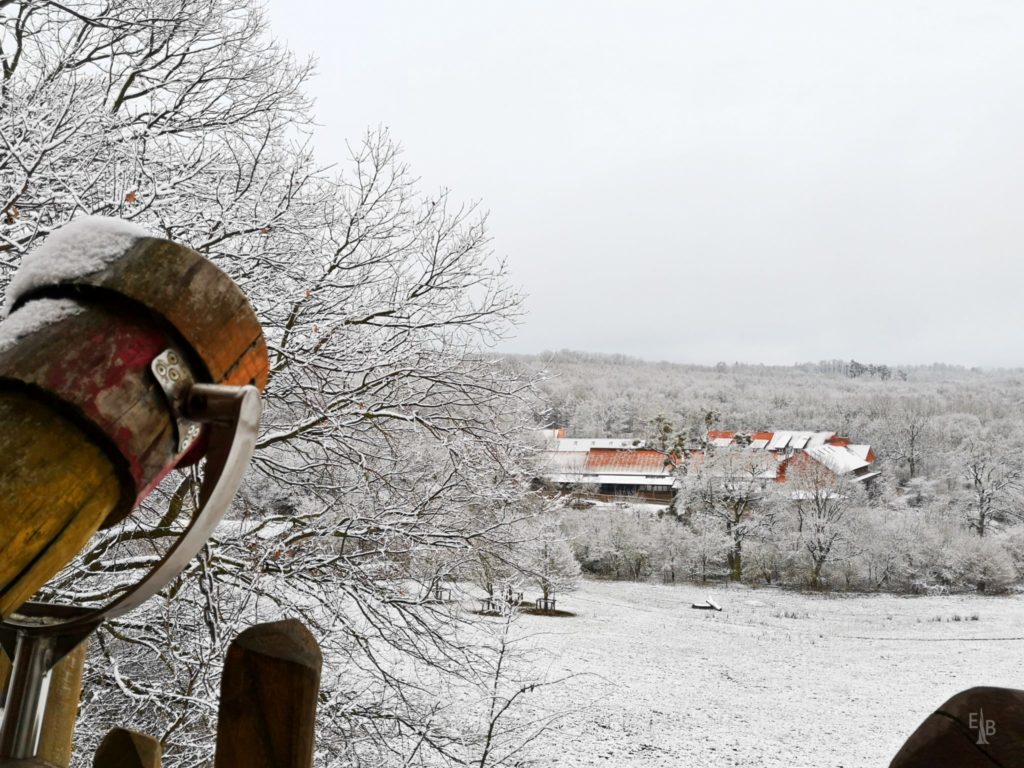 Titelbild: Winterlicher Blick vom Kika-Baumhaus auf Gut Herbigshagen