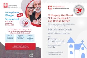 Der ökumenische Schlagergottesdienst „Ich werde da sein“ wird am Freitag, 27. März 2026, um 18 Uhr im Lorenz-Werthmann-Haus mit Lektorin Christiane Koch und Vikar Simon Heuer gefeiert.