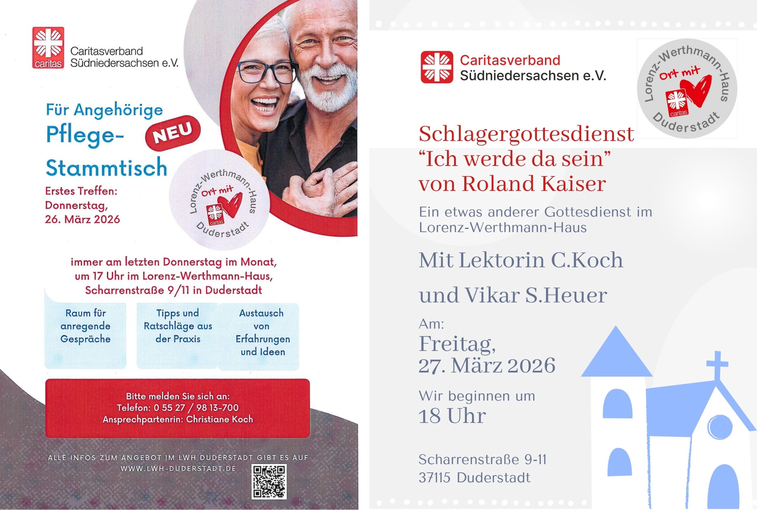 Der ökumenische Schlagergottesdienst „Ich werde da sein“ wird am Freitag, 27. März 2026, um 18 Uhr im Lorenz-Werthmann-Haus mit Lektorin Christiane Koch und Vikar Simon Heuer gefeiert.