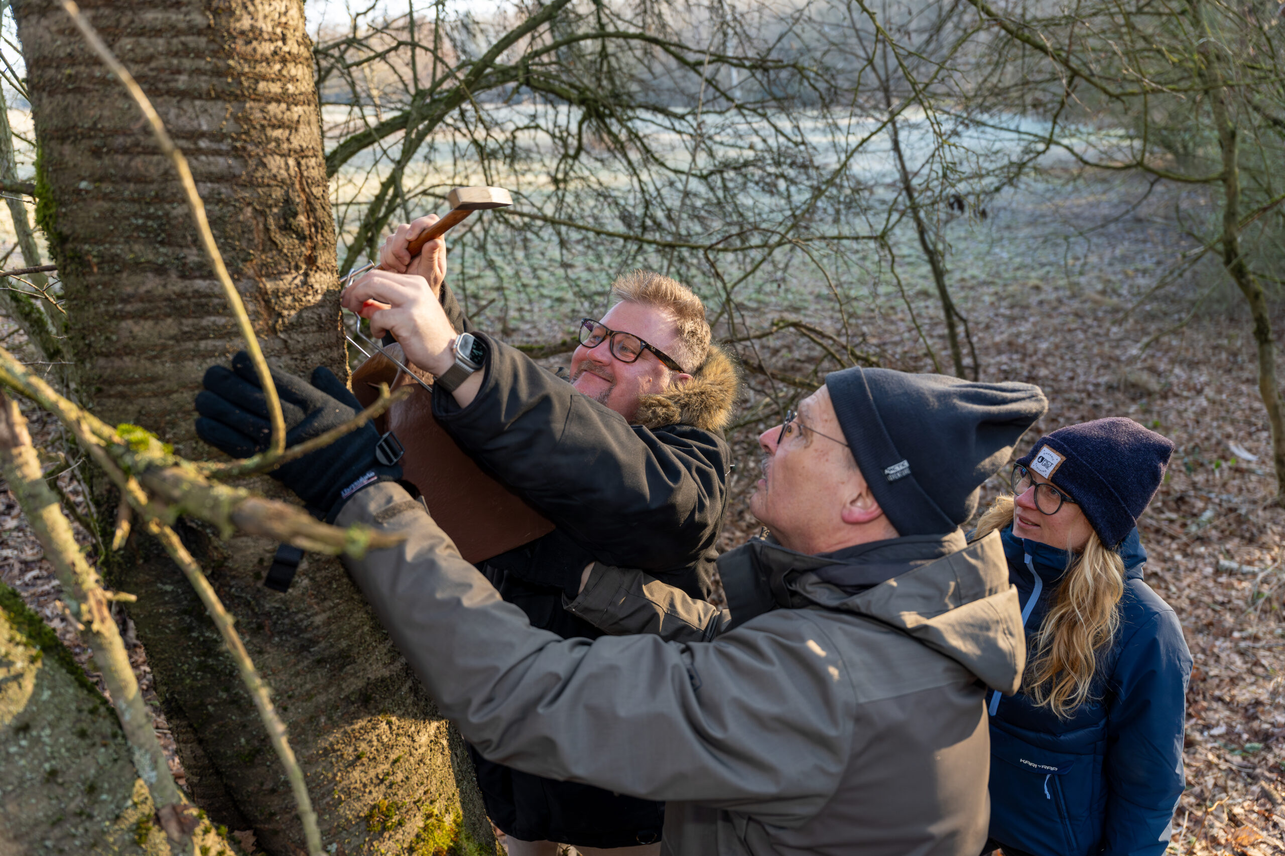 Um der streng geschützten Haselmaus Nistplätze zu ermöglichen, haben Bürgermeister Thorsten Feike, Kristina Ebert von der Stadt Duderstadt und Karl-Josef Merten vom Naturschutzbund (NABU) Obereichsfeld sogenannte Nistkobel im Duderstädter Naherholungsgebiet Im Leeren angebracht. Ziel der Maßnahme ist es, mögliche Vorkommen der Haselmaus im Stadtgebiet nachzuweisen und langfristig zu sichern.