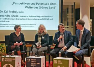 Im Dezember 2023 wurde in der Kulturministerkonferenz beschlossen, das Grüne Band als erste gemischte Welterbestätte Deutschlands für Natur und Kultur vorzuschlagen. Wie also sähe der weitere Weg zur Nominierung aus? Über Perspektiven und Potenziale disktutierten Dr. Alexandra Kruse (Referentin „Auf dem Weg zum Welterbe – Der Natur- und Kulturraum Grünes Band“, Kooperationsprojekt BUND und Deutscher Kulturrat) und Prof. Dr. Kai Frobel (BUND) mit Mira Keune und Jochen Paleit.