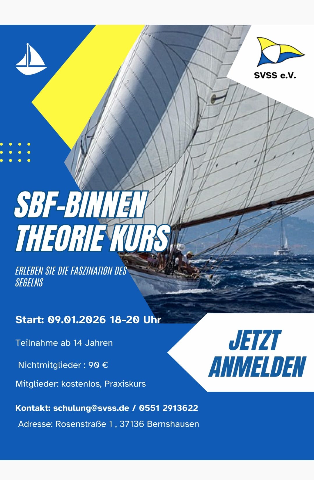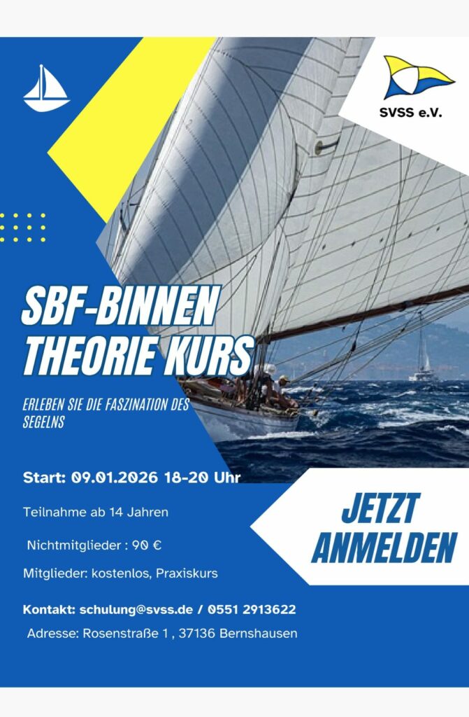 Die Segler-Vereinigung Seeburger See (SVSS) bietet einen Theoriekurs zum Sportboot-Führerschein Binnen an, wo auch Nicht-Mitglieder teilnehmen können. Der Kurs startet am Freitag, 9. Januar 2026, um 18 Uhr im Bruder-Niels-Haus, Rosenstraße 1, in Bernshausen. Für Vereinsmitglieder ist der Kurs kostenfrei, für Nicht-Vereinsmitglieder kostet die Teilnahme 90 Euro.